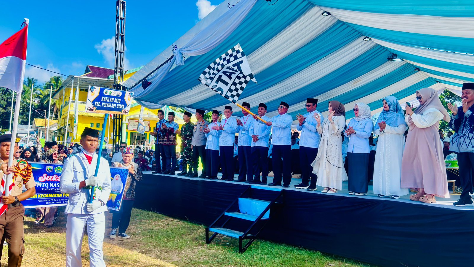 Keterangan Gambar : Bupati Kotabaru, Muh Rusli, S.Sos, secara resmi mengukuhkan Dewan Hakim sekaligus melepas pawai ta’aruf Musabaqah Tilawatil Quran (MTQ) Nasional ke-56 tingkat Kabupaten Kotabaru, Rabu (1/4/2026) di Lapangan Madarammang, Tanjung Seloka, Kecamatan Pulau Laut Selatan.