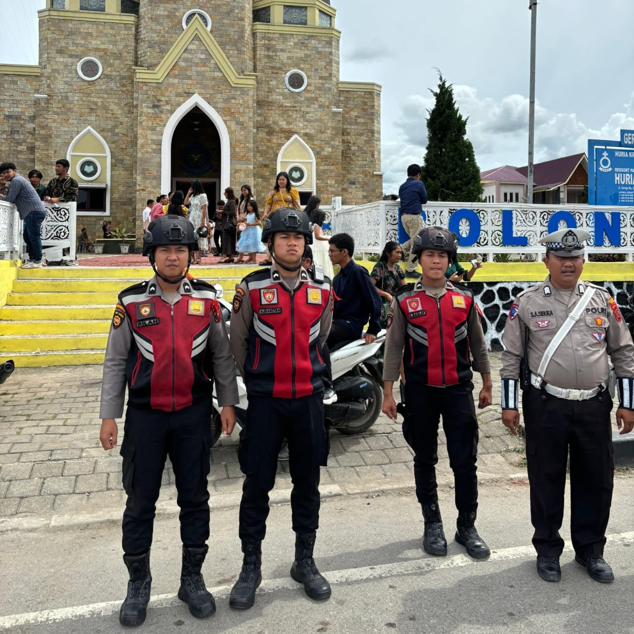 Keterangan Gambar : Personel Polres Samosir saat amankan ibadah Minggu, (22/12/24).