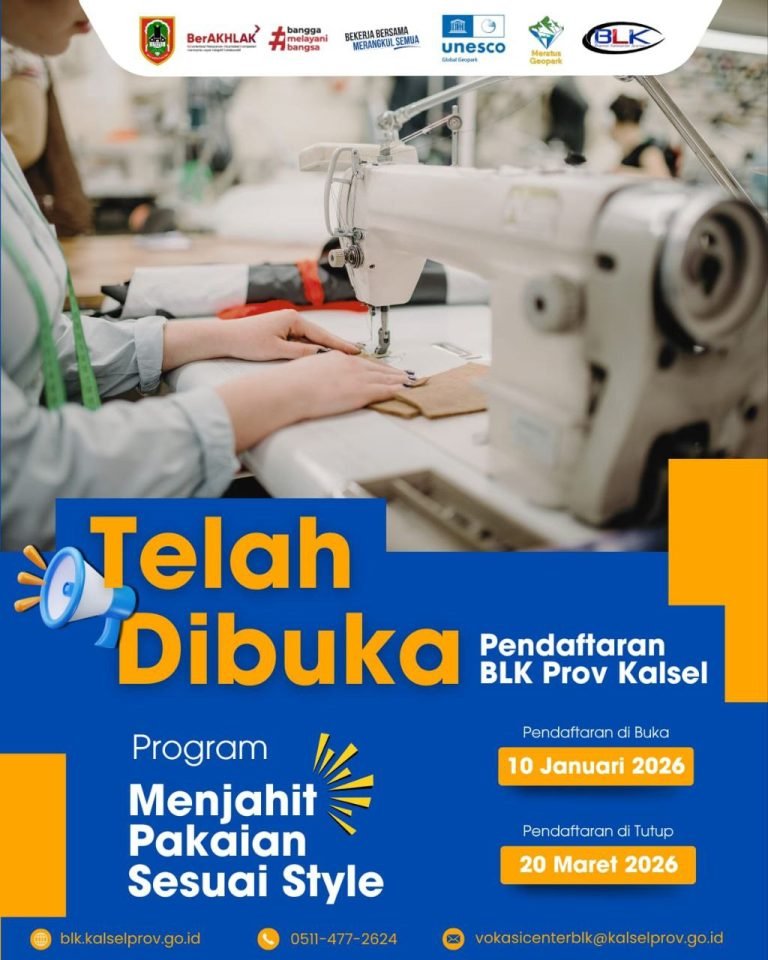 Balai Latihan Kerja (BLK) di bawah Dinas Tenaga Kerja dan Transmigrasi (Disnakertrans) Provinsi Kalimantan Selatan secara resmi membuka pendaftaran program pelatihan kerja Tahun 2026 yang didanai melalui APBD Provinsi Kalimantan Selatan.