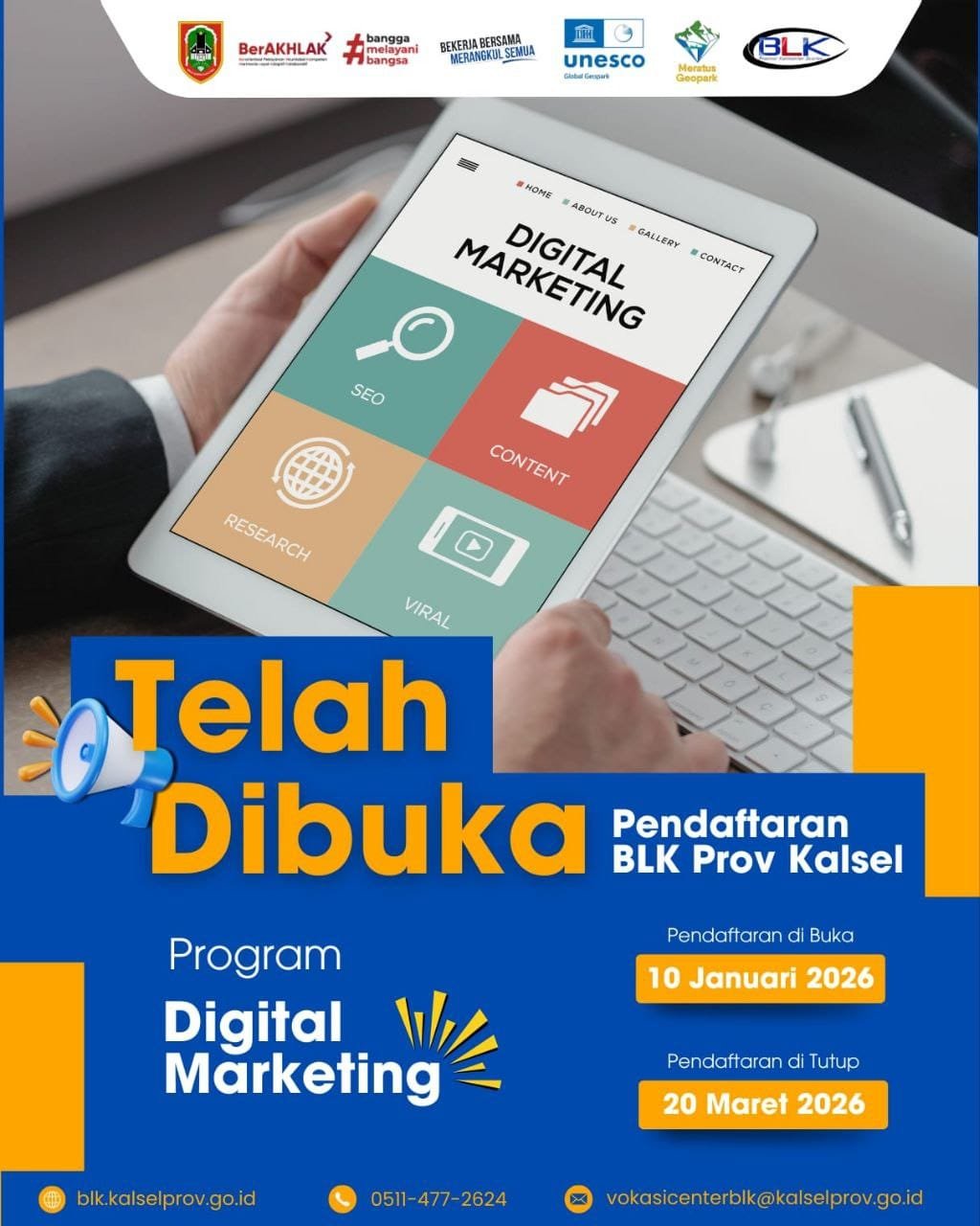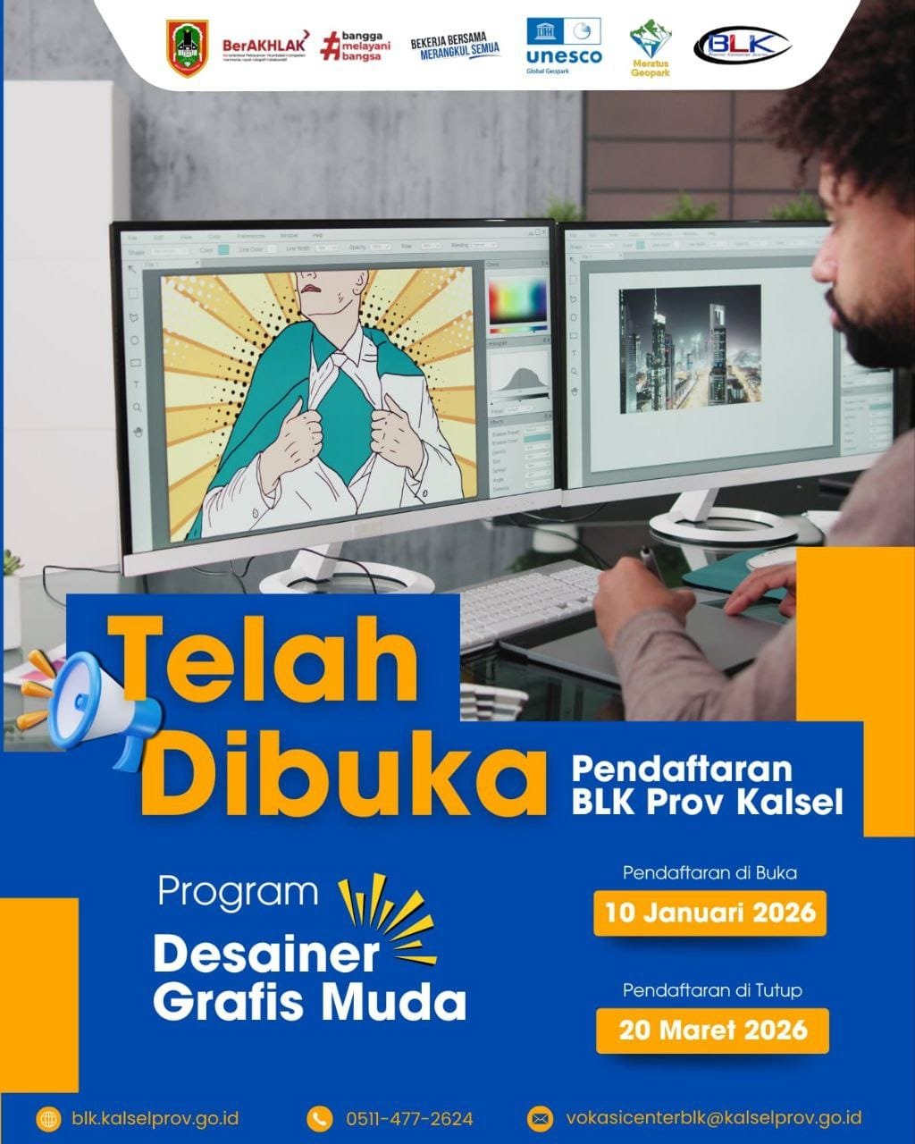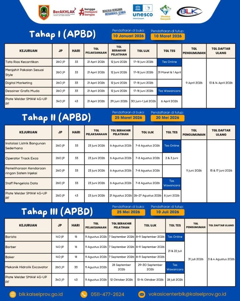 Untuk informasi selanjutnya, BLK Kalsel menympaikan bahwa Pendaftaran dilakukan secara daring melalui, https://bit.ly/Pendaftaranblk2026, atau mengunjungi media sosial (Instagram) resmi BLK Kalsel https://www.instagram.com/blk_banjarbaru_prov_kalsel/ (red/ril)
