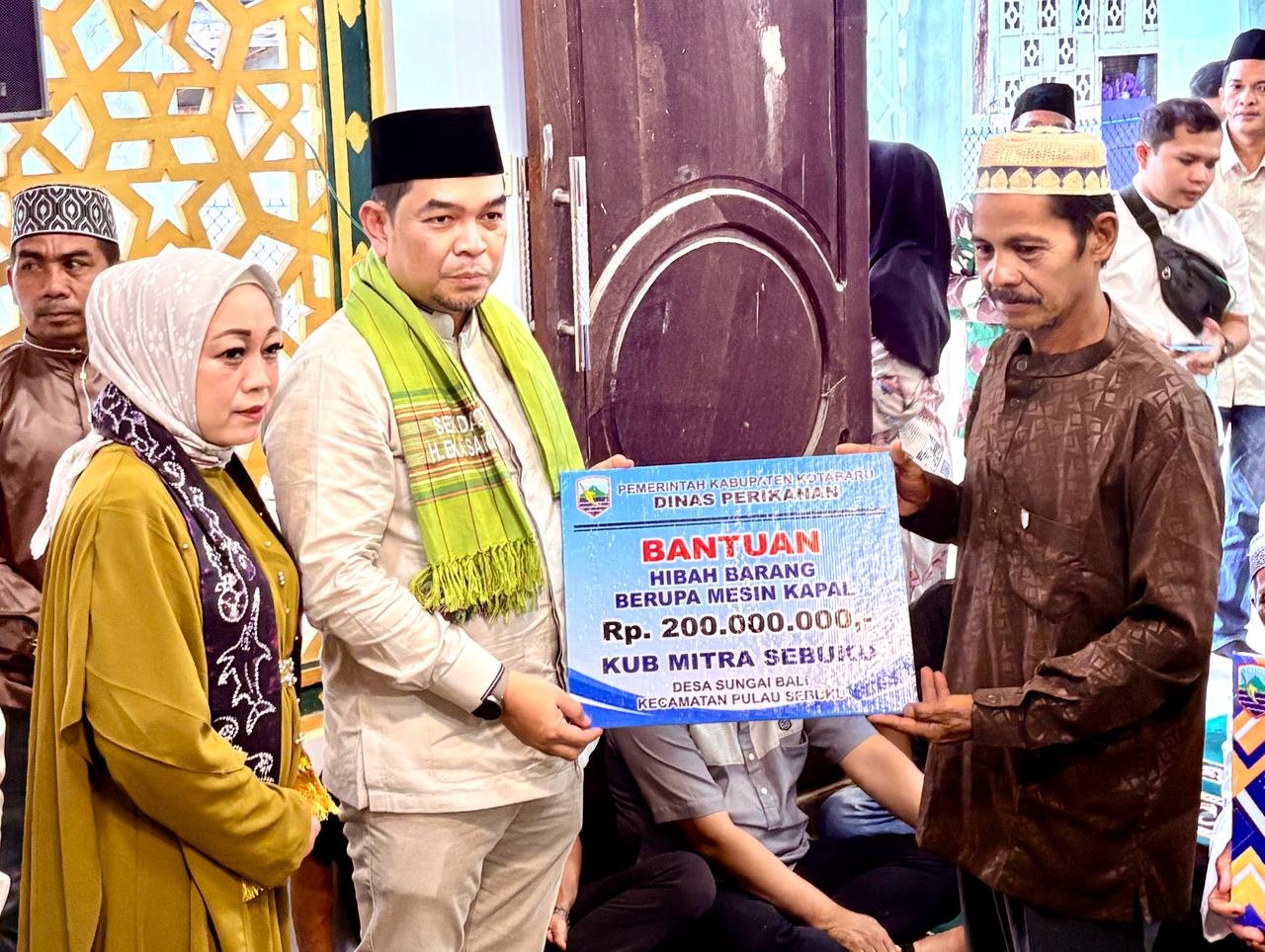 Serta diserahkan juga hibah barang berupa mesin kapal sebesar Rp. 200. 000. 000,- dan peralatan pengolahan pemasar dan pengumpul hasil perikanan sebesar Rp. 100. 000. 000,- dari Dinas Perikanan.