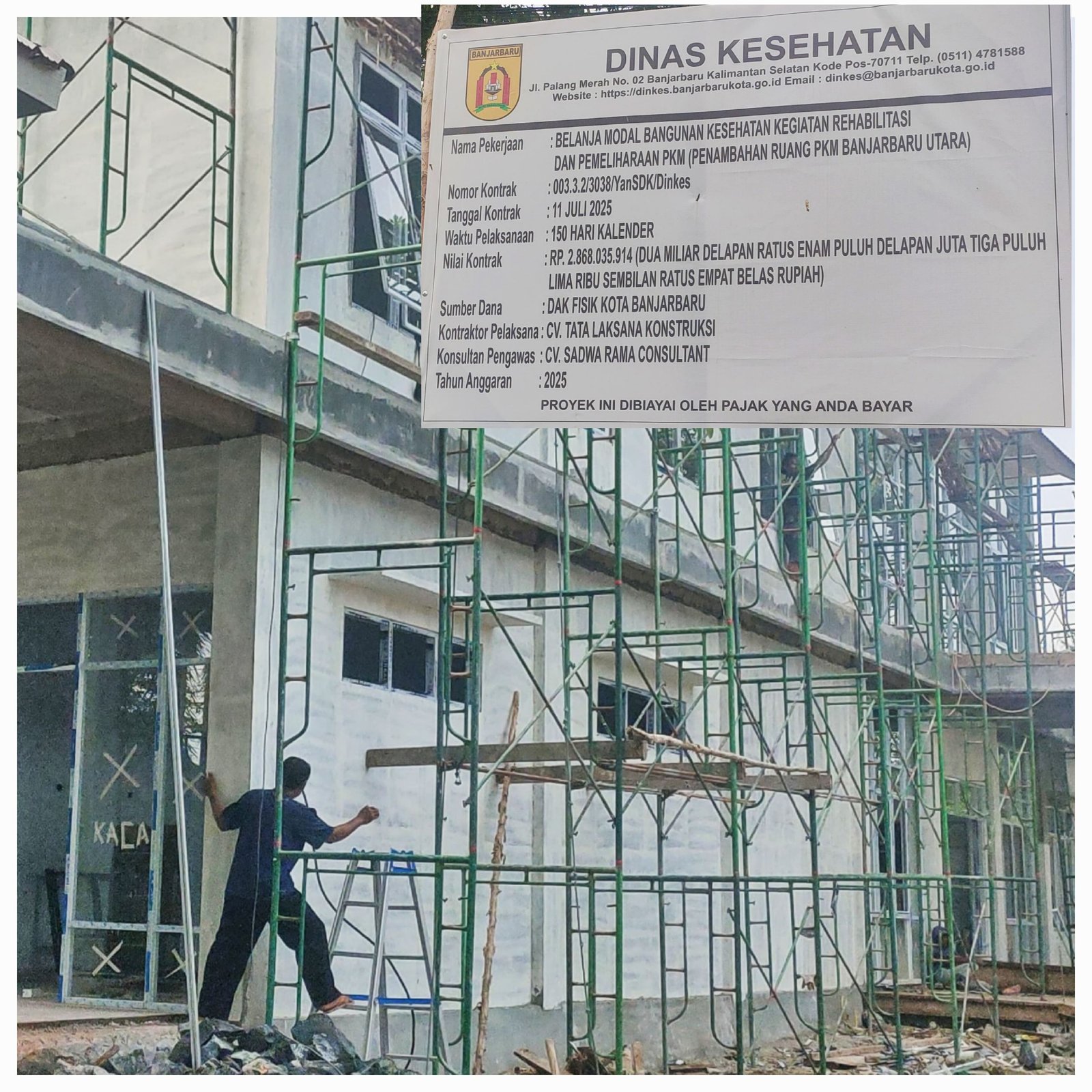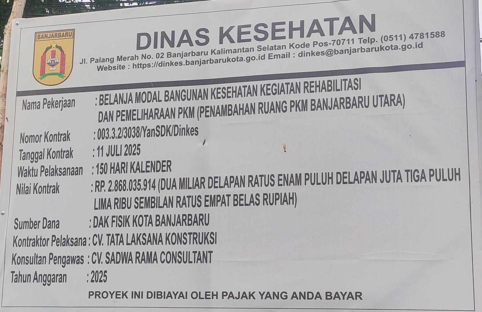 Berdasarkan papan informasi proyek dari Dinas Kesehatan Kota Banjarbaru, Belanja Modal Bangunan Kesehatan Kegiatan Rehabilitasi dan Pemeliharaan PKM dengan nilai kontrak mencapai Rp 2.868.035.914.