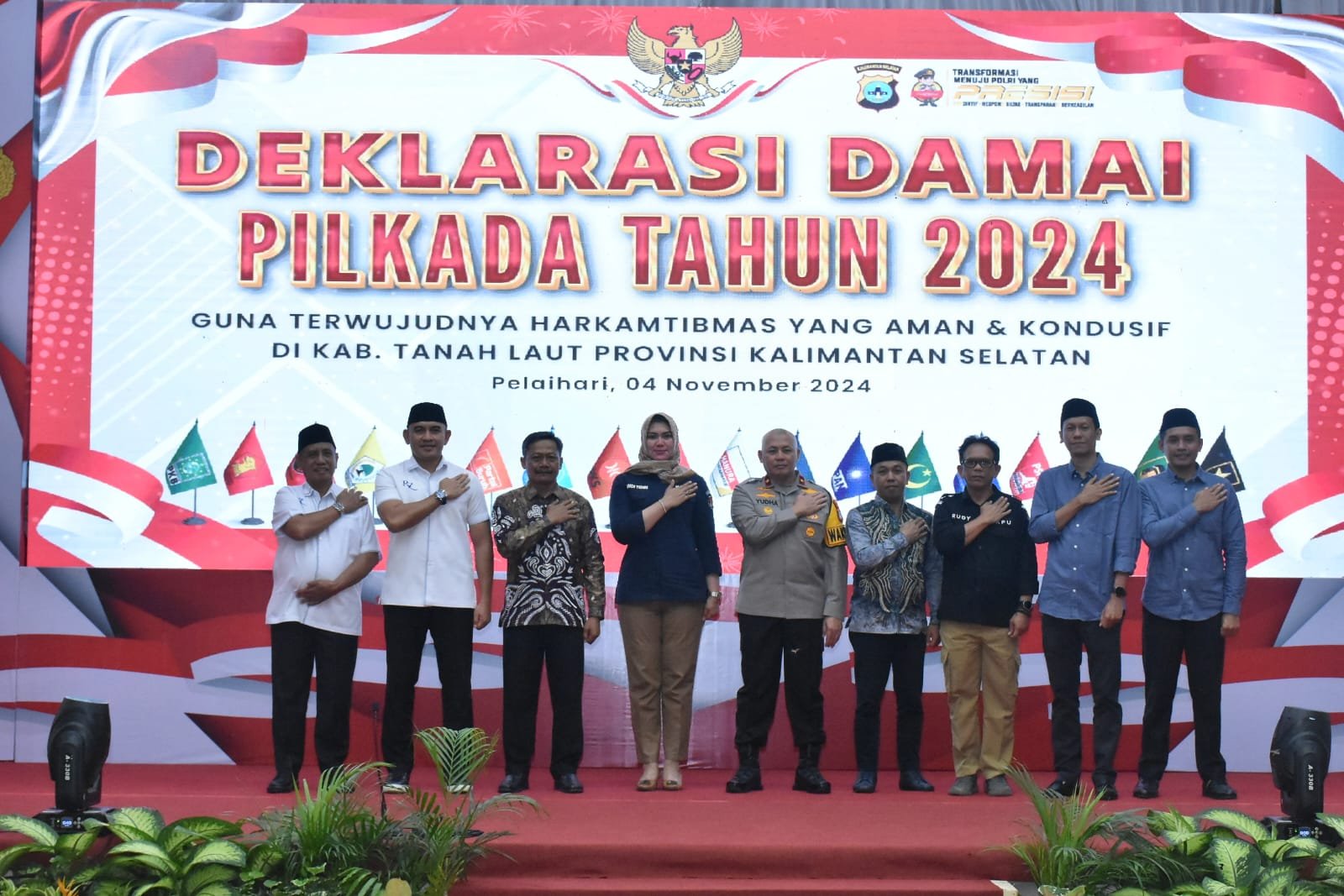 Acara deklarasi ini dihadiri oleh Wakapolda Kalsel, Tuan Guru H. Mukri Yunus selaku Pimpinan Ponpres Nurul Hijrah Jorong, Ketua KPU Provinsi Kalsel, Ketua Bawaslu Provinsi Kalsel, Pejabat Utama Polda Kalsel, Pj Bupati Kabupaten Tanah Laut, Kapolres Tanah Laut, Forkopimda Kabupaten Tanah Laut, Ketua KPU Kabupaten Tanah Laut, Ketua Bawaslu Kabupaten Tanah Laut, para Paslon Bupati dan Wakil Bupati Kabupaten Tanah Laut serta Perwakilan Partai Politik Kabupaten Tanah Laut.
