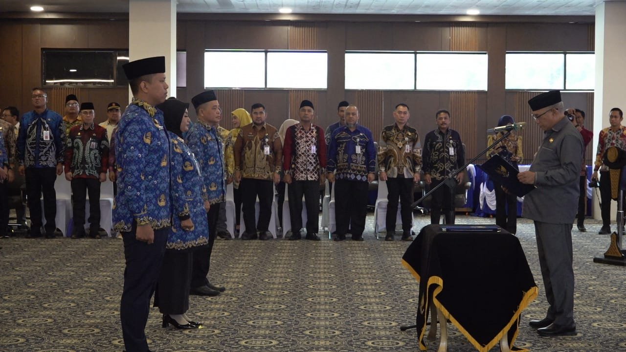 Keterangan Gambar : Bupati Kotabaru Muhammad Rusli, S.Sos melantik pejabat administrator, pengawas, serta pejabat fungsional di lingkungan Pemerintah Kabupaten Kotabaru sekaligus mengukuhkan kepala puskesmas di lingkungan Dinas Kesehatan Kabupaten Kotabaru, Kamis (12/3/2026).