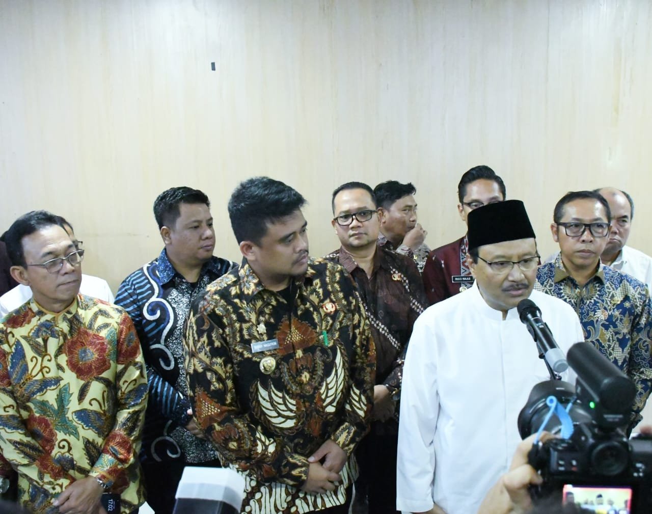 Keterangan Gambar : Gubsu dampingi Menteri Sosial RI, Saifullah Yusuf usai Sosialisasi Pembentukan Sekolah Rakyat, Jumat (11/4/2025).