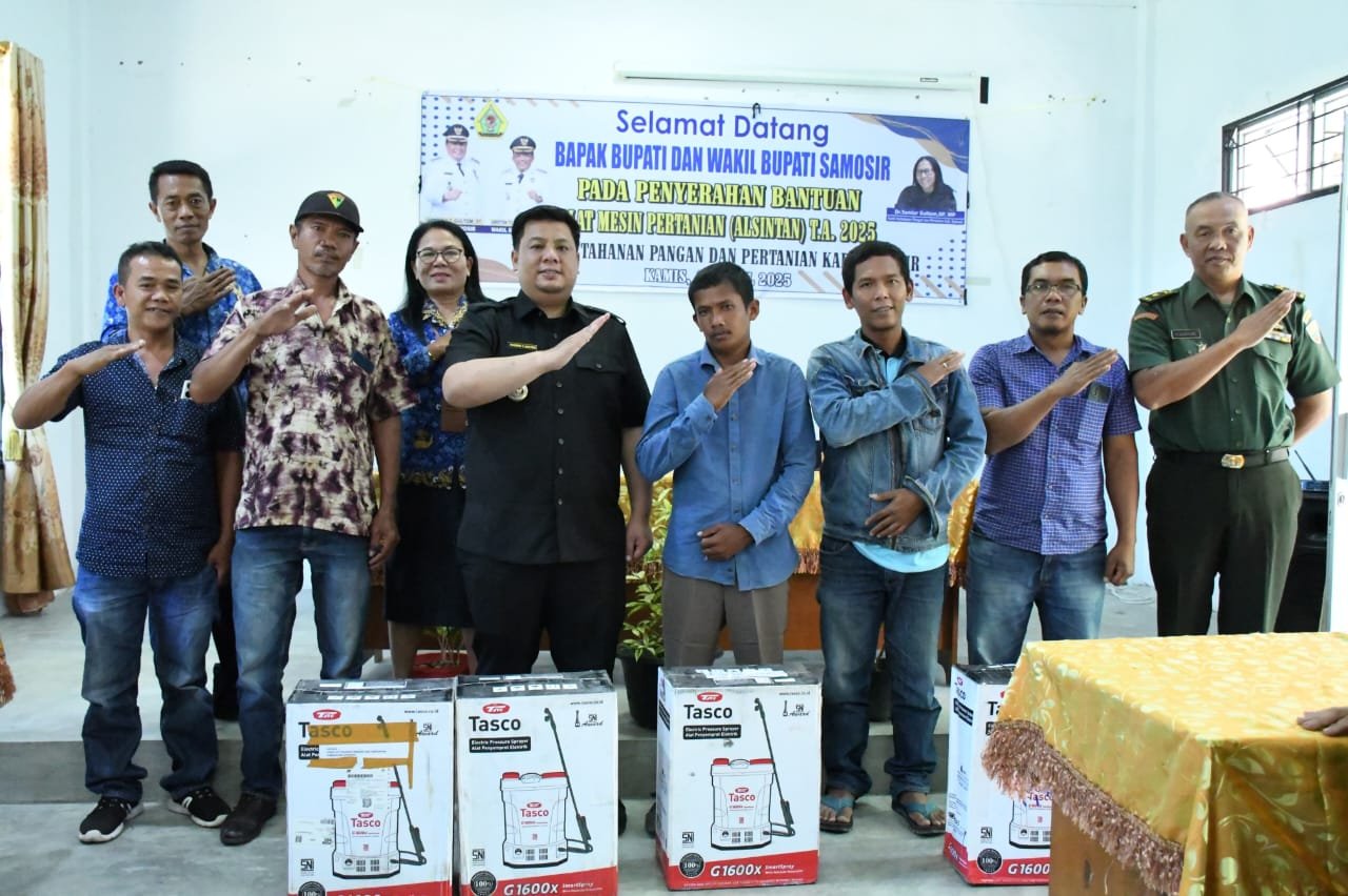 Samosir Borneopos.com - Bupati Samosir Vandiko Timotius Gultom, ST didampingi Kadis Ketapang dan Pertanian Dr. Tumiur Gultom, SP, MP menyerahkan bantuan alat mesin pertanian (alsintan) sumber dana APBN 2025, kepada 3 (tiga) kelompok tani penerima, di Kantor Dinas Ketapang dan Pertanian, Kamis (17/4/2025).