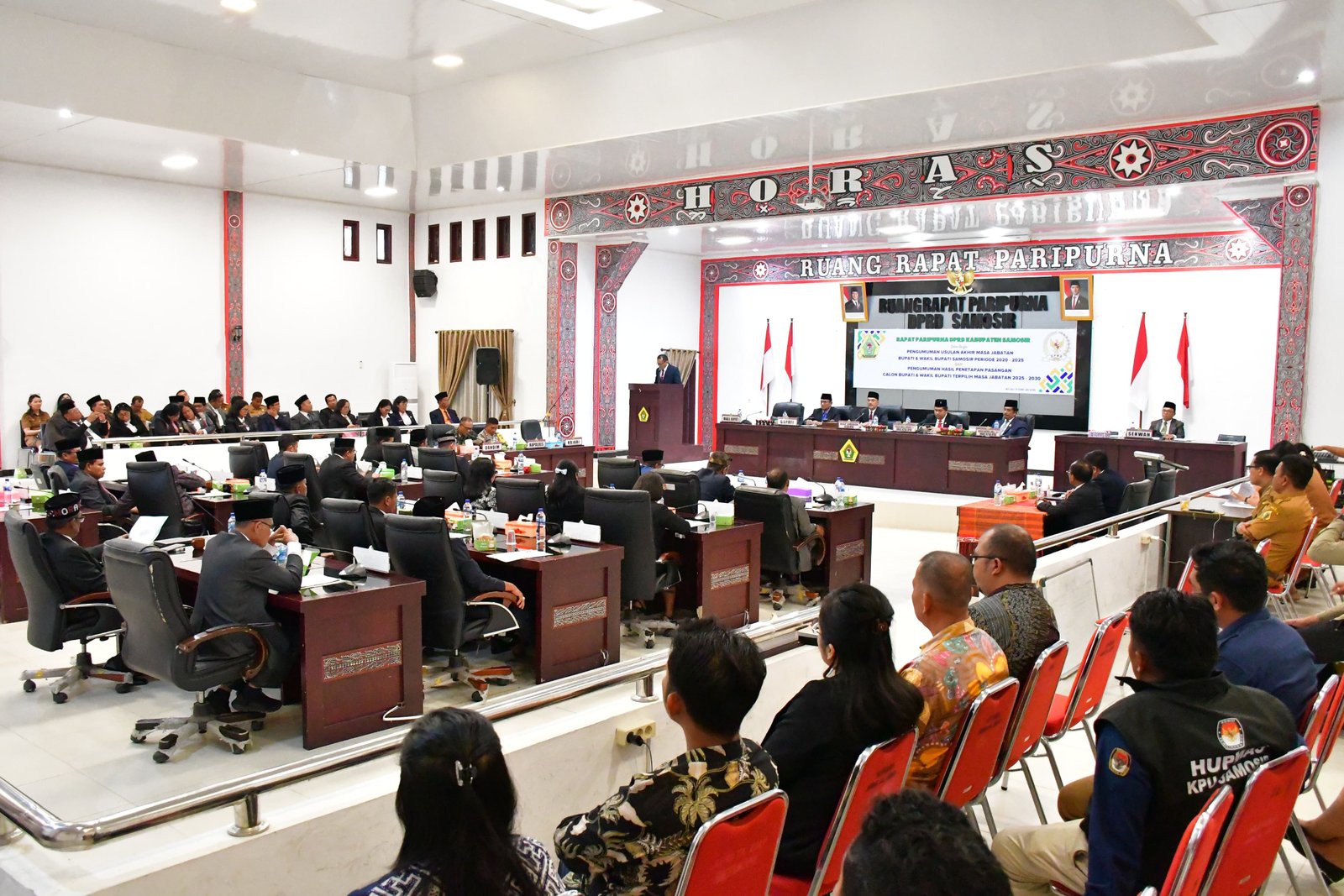 Samosir, Borneo Pos -- Dewan Perwakilan Rakyat Daerah (DPRD) Kabupaten Samosir menggelar sidang paripurna untuk mengumumkan penetapan Bupati dan Wakil Bupati Samosir terpilih masa jabatan 2025-2030, hasil pemilihan kepala daerah (Pilkada) 2024 di Gedung Paripurna DPRD Samosir, Selasa (11/2/25).
