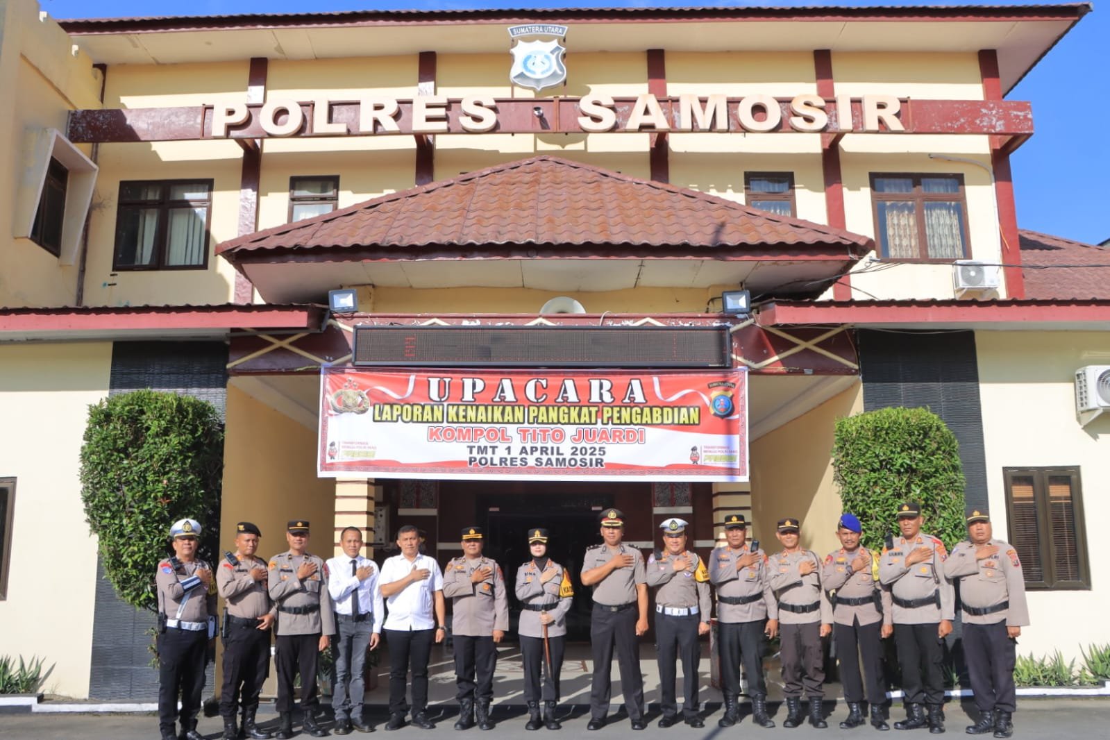 Samosir, Borneopos.com – Suasana haru dan bangga menyelimuti Mapolres Samosir. Upacara kenaikan pangkat pengabdian dari AKP menjadi Kompol digelar khidmat di Lapangan Apel Mako Polres Samosir.