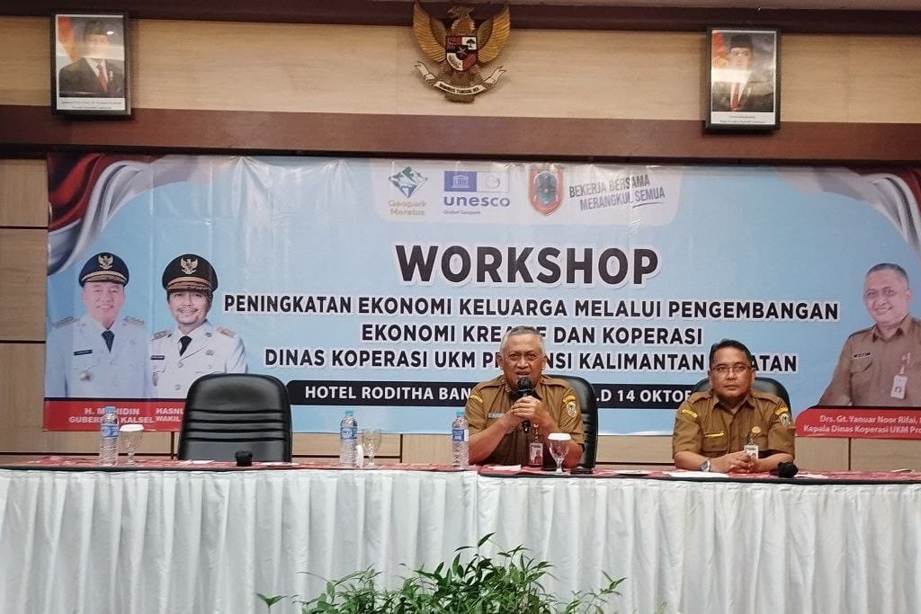 Banjarmasin, Borneopos.com - Pemerintah Provinsi Kalimantan Selatan terus berupaya memperkuat ekonomi keluarga melalui pemberdayaan koperasi dan pelaku usaha mikro, kecil, dan menengah (UMKM). Hal ini disampaikan oleh Kepala Dinas Koperasi dan UKM Provinsi Kalimantan Selatan, Gusti Yanuar Noor Rifai, saat memberikan paparan dalam Workshop Peningkatan Ekonomi Keluarga melalui Pengembangan Ekonomi Kreatif dan Koperasi di salah satu hotel di Banjarmasin, Selasa (14/10/2025).