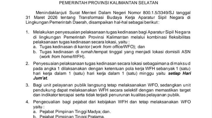Keterangan Gambar : - Pemerintah Provinsi Kalimantan Selatan melalui Sekretaris Daerah (Sekda) resmi menerapkan kebijakan transformasi budaya kerja bagi Aparatur Sipil Negara (ASN) di lingkungan Pemprov Kalsel, sebagaimana yang tertuang dalam Surat Edaran Nomor 100.3.4.1/00652/ORG/2026 yang mulai berlaku sejak 1 April 2026. - Pemerintah Provinsi Kalimantan Selatan melalui Sekretaris Daerah (Sekda) resmi menerapkan kebijakan transformasi budaya kerja bagi Aparatur Sipil Negara (ASN) di lingkungan Pemprov Kalsel, sebagaimana yang tertuang dalam Surat Edaran Nomor 100.3.4.1/00652/ORG/2026 yang mulai berlaku sejak 1 April 2026.