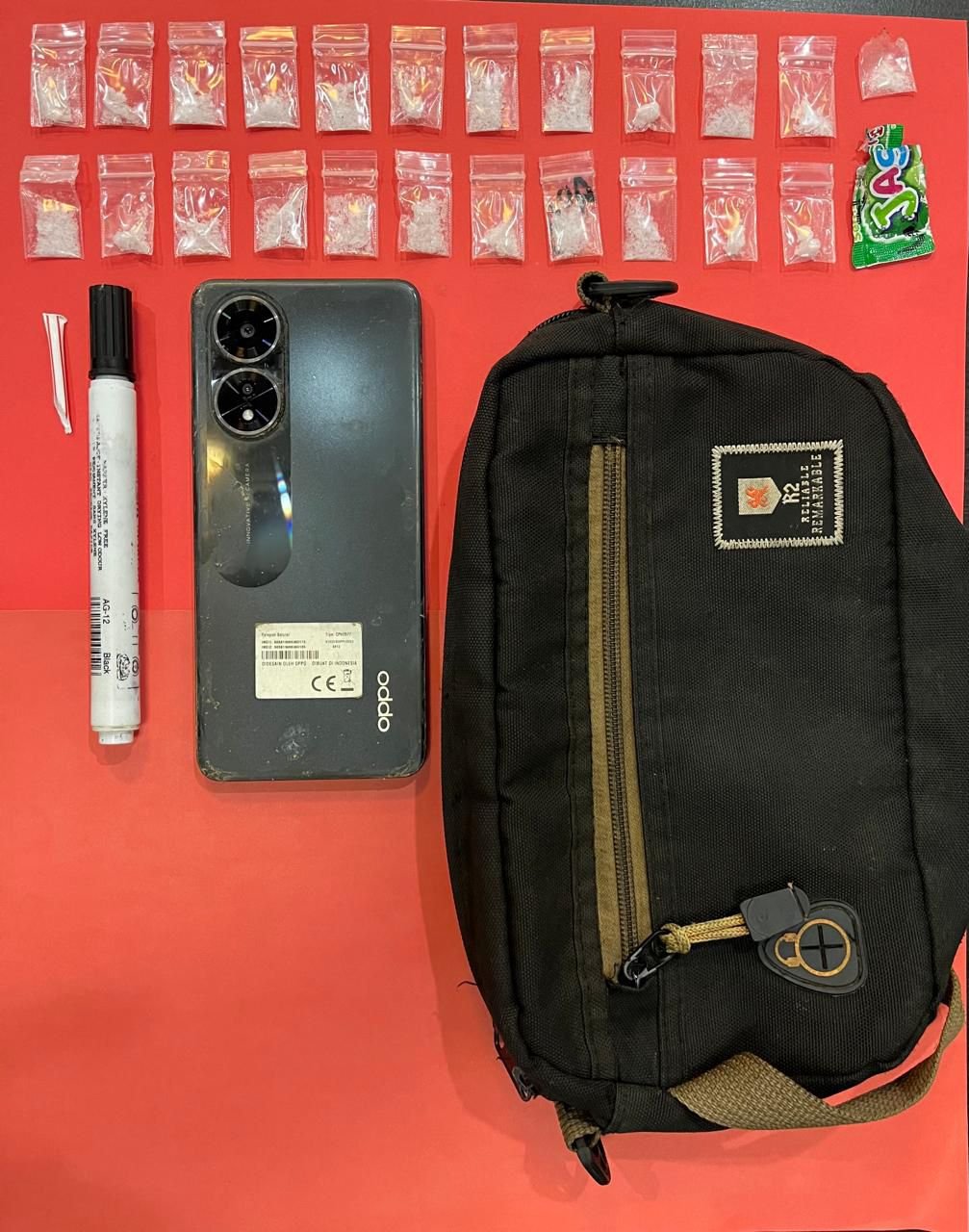 Dari tangan pelaku, polisi berhasil menyita barang bukti berupa 23 paket narkotika jenis sabu dengan berat kotor 5,68 gram dan berat bersih 3,84 gram. Selain itu, barang bukti lain yang diamankan meliputi satu potongan plastik jas jus, satu tas warna hitam, satu spidol, satu sendok yang terbuat dari sedotan, dan satu unit ponsel merek Oppo berwarna hitam