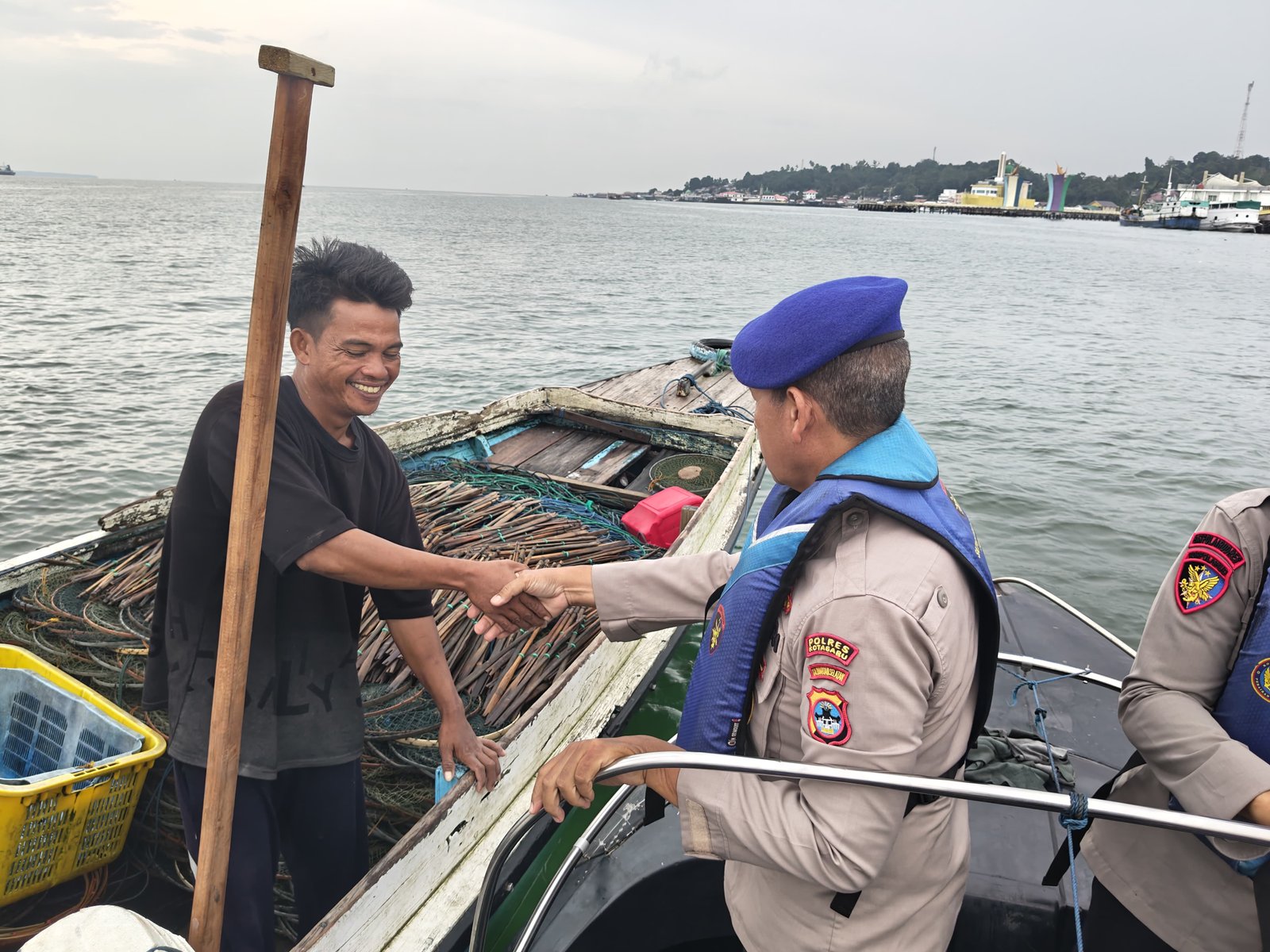 Keterangan Gambar : Satuan Polisi Perairan dan Udara (Sat Polairud) Polres Kotabaru melaksanakan kegiatan bakti sosial (bansos) dengan membagikan paket sembako kepada nelayan tradisional di wilayah perairan Selat Laut Kotabaru, Rabu (04/03/2026) pukul 11.02 WITA.